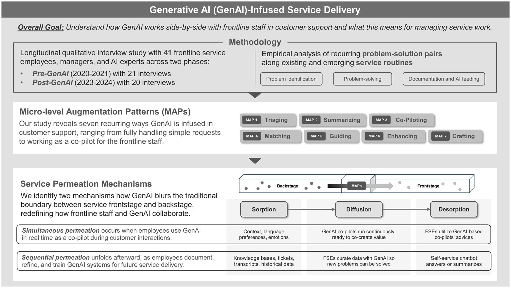 Abstract: The infusion of generative AI (GenAI) is already disrupting established services. This technology’s generative and agentic nature challenges the design and management of service routines, which have been previously handled primarily by frontline service employees. Guided by organizational routines theory, our longitudinal study (2020–2024) examines how the infusion of GenAI changes routines in customer support services. We gathered interview data from 41 employees, managers, and AI experts in two phases, pre- and post-GenAI. Based on the analysis of the qualitative data, we revealed seven recurring micro-level augmentation patterns, illustrating how GenAI-infused service routines function. The results show that GenAI is primarily embedded in the backstage of knowledge-intensive services, from which it then permeates the frontstage. We contribute to the literature on hybrid human–AI service delivery by identifying augmentation patterns and conceptualizing service permeation via two mechanisms: (1) simultaneous service permeation, which unfolds as employees leverage GenAI in real-time and integrate GenAI’s responses, recommendations, and adaptations into the frontstage; (2) sequential service permeation, which emerges as employees perform new routines of documentation and AI feeding to facilitate GenAI’s adaptability in frontstage and backstage operations. The MAPs and service permeation mechanisms guide practitioners in integrating GenAI into service routines and managing novel employee-GenAI collaborations.